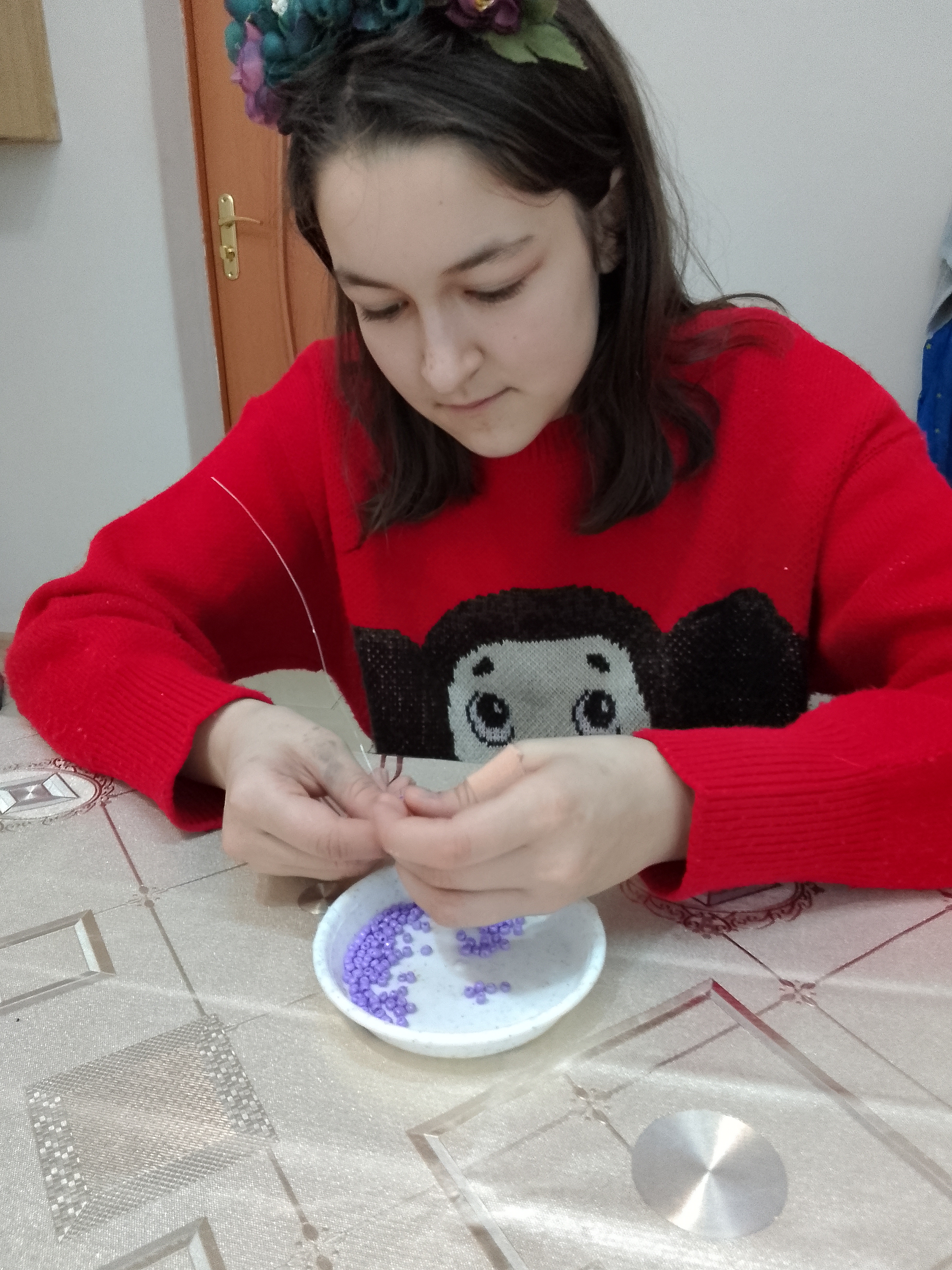 В процессе работы педагог дополнительного образования рассказала о технике безопасности при работе с крупным и мелким бисером, проволокой и ножницами, обозначила материалы и представила техники плетения.