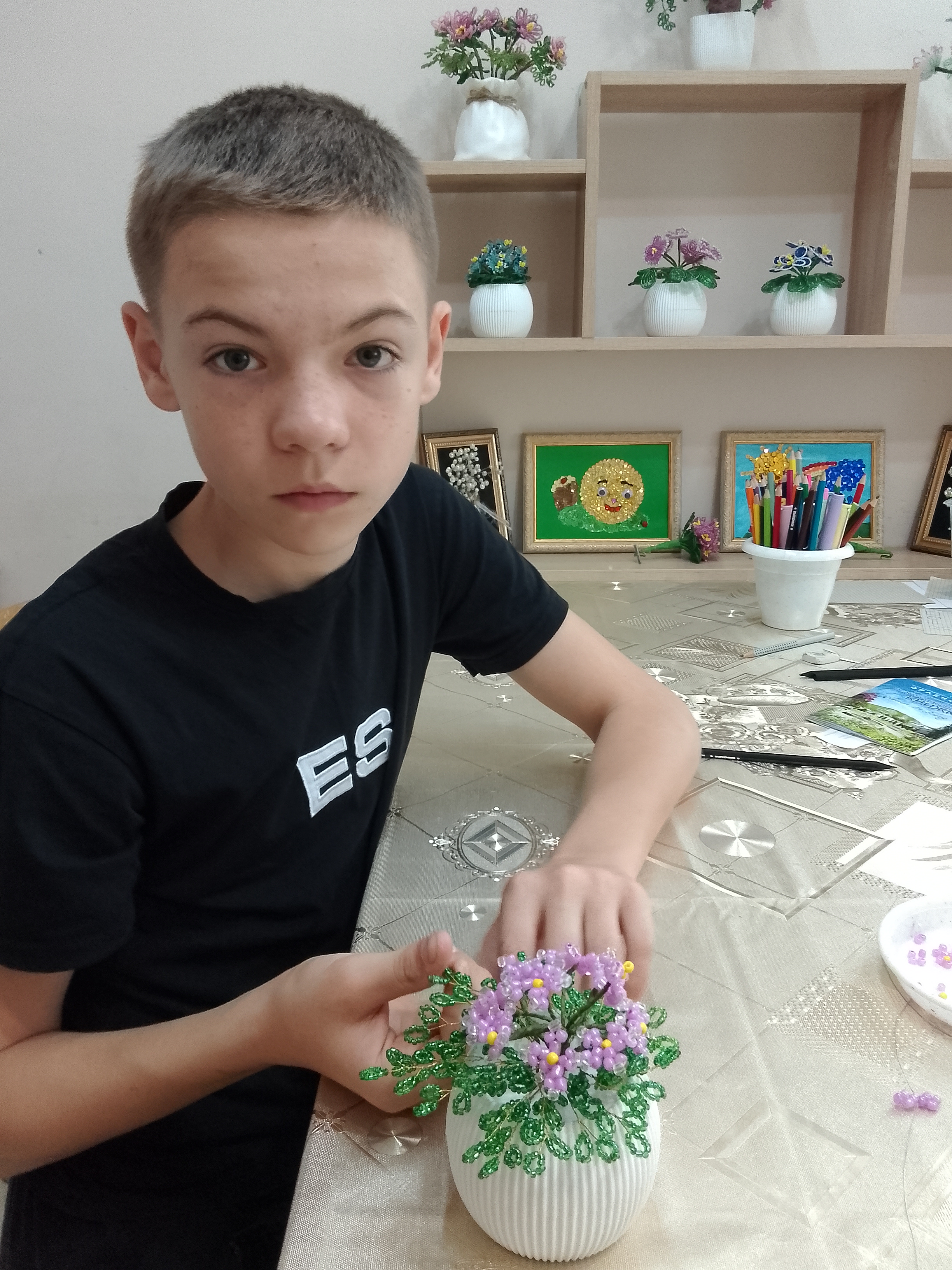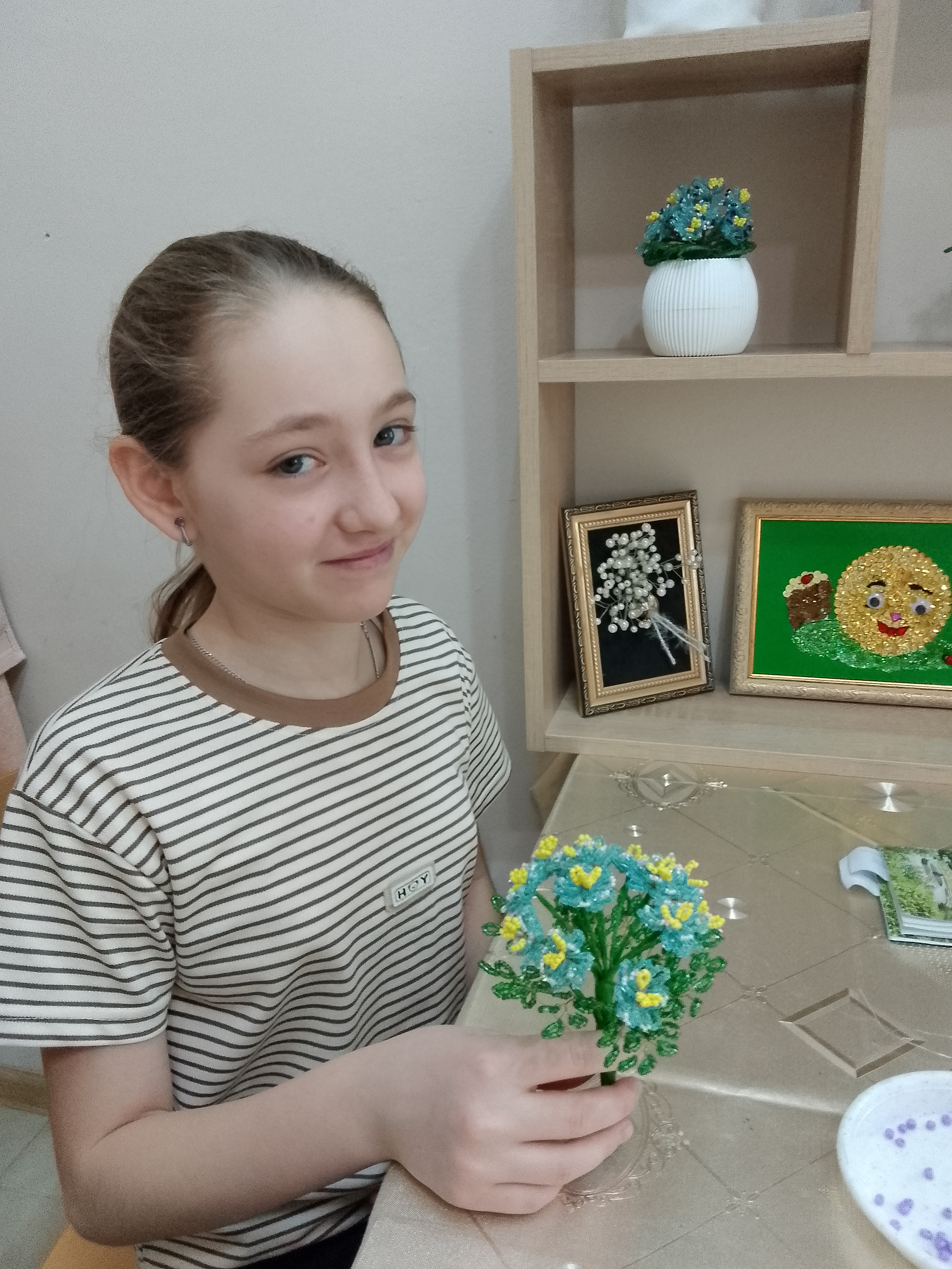 Ребята с интересом осваивали навыки работы с бисером и проволокой под руководством педагога, создавая яркие букеты цветов. Это способствовало не только положительному эмоциональному настроению, но и, развитию мелкой моторики рук, разговорной речи, глазомера, зрительного и эстетического восприятия, образного мышления.