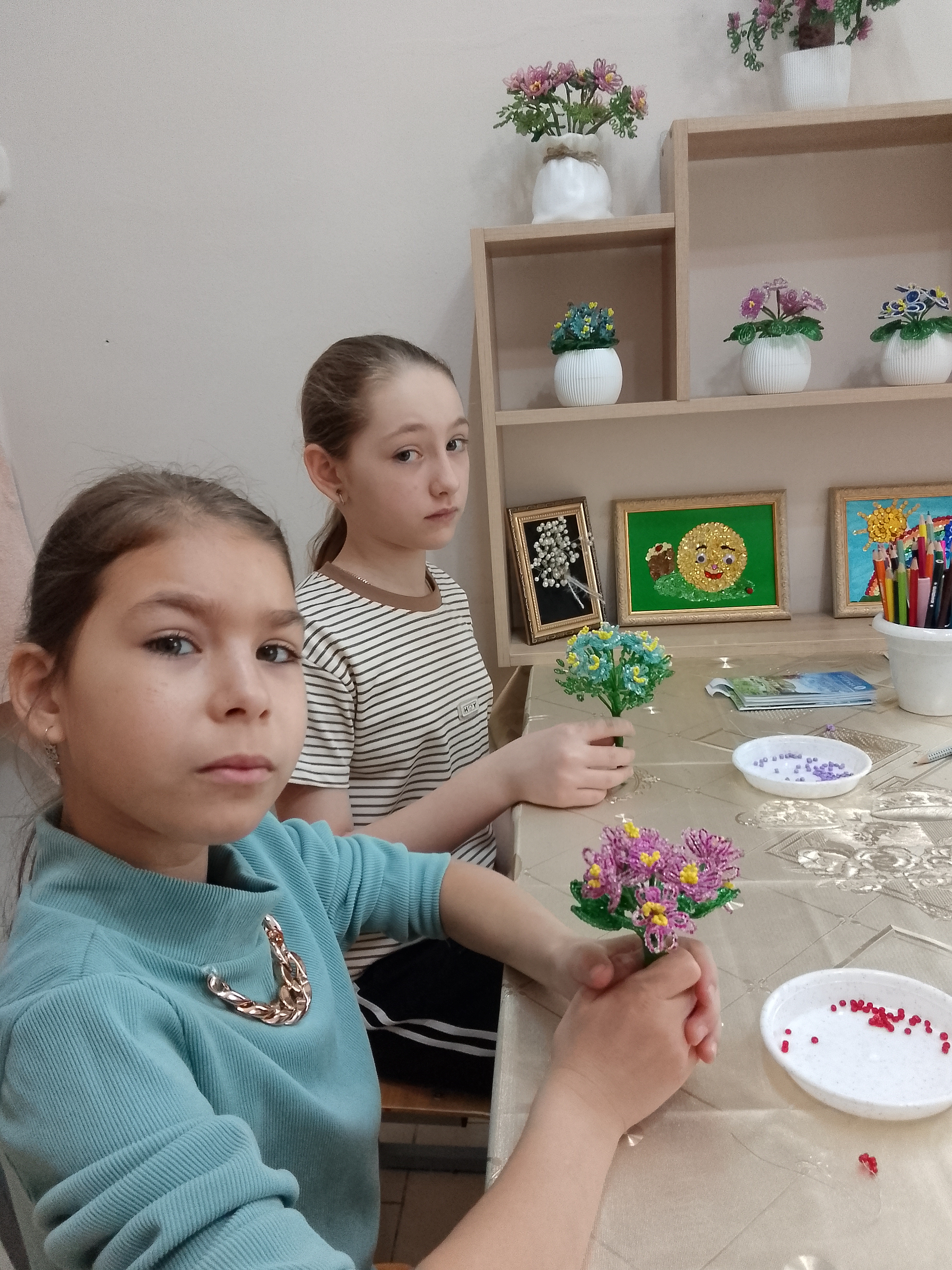 Ребята с интересом осваивали навыки работы с бисером и проволокой под руководством педагога, создавая яркие букеты цветов. Это способствовало не только положительному эмоциональному настроению, но и, развитию мелкой моторики рук, разговорной речи, глазомера, зрительного и эстетического восприятия, образного мышления.